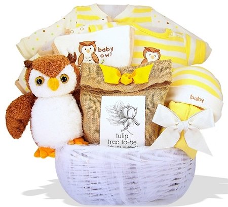 (1) White Nursery Wicker Basket (1) Personalized Melissa and Doug Door Plaque (1) Owl Baby Polka Dot Onesie (100% Cotton - Size 3 -6 Months) (1) Owl Baby Pants (100% Cotton - Size 3 -6 Months) (1) Owl Baby Applique Romper (100% Cotton - Size 3 -6 Months) (1) Owl Baby Applique Bib (100% Cotton - Size 3 -6 Months) (1) Satin Baby Clothes Hanger (1) Tulip Tree-To-Be Kit (1) Adorable Plush Owl (9 inches tall) (1) Owl Baby Applique Baby Hat (100% Cotton - Size 3 -6 Months) (1) Owl Baby Applique Onesie (100% Cotton - Size 3 -6 Months)