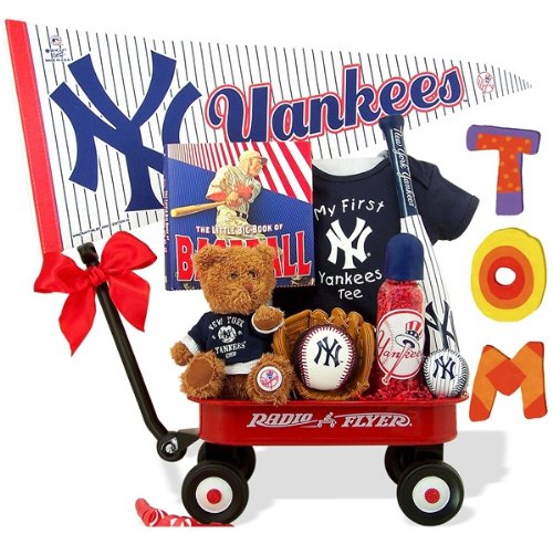 All items are 100% Officially licensed products of Major League Baseball. (1) Yankees Hoodie Teddy Bear (9 inches) (1) The Little Big Book of Baseball (Hardcover, 352 pages) (1) Authentic Radio Flyer Wagon (1) My First Yankees Tee - Blue - (Size 3 -6 Mos) (1) Yankees Baby Bottle (9 oz) (1) Yankees Full Size Ball & Mini Glove Set (1) Yankees Softee Bat & Ball Set (1) Yankees Full Size Pennant (12" x 30")