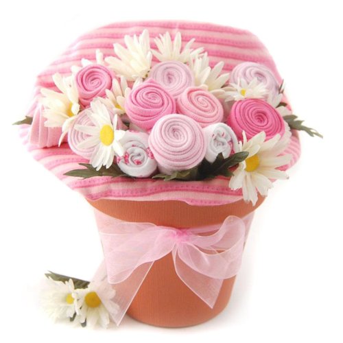 Design mimics a flowerpot Onesies are sized for 3 to 6 months Infant girl clothing gift basket Bibs, onesies, blankets, and more